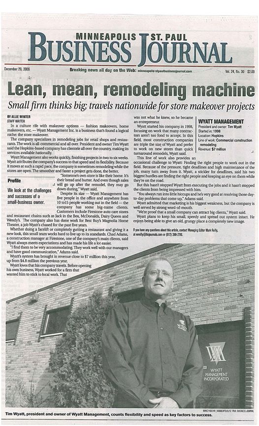 Press Room Women in Construction about Women in Construction Making Houston’s Fast 50 List about Making Houston’s Fast 50 List WYATT WINS THE GOLD FOR MOST INNOVATIVE! about WYATT WINS THE GOLD FOR MOST INNOVATIVE! WYATT DIGS IN WITH HAWAIIAN BROS about WYATT DIGS IN WITH HAWAIIAN BROS FIRST IN TEXAS about FIRST IN TEXAS WYATT BUILDS BETTER FOR THE FUTURE about WYATT BUILDS BETTER FOR THE FUTURE WHERE LEADERS ARE LAUNCHED about WHERE LEADERS ARE LAUNCHED JEANNETTE WYATT TOP 10 CHIEF MARKETERS 2021 about JEANNETTE WYATT TOP 10 CHIEF MARKETERS 2021 BOSS LADY MEANS BUSINESS about BOSS LADY MEANS BUSINESS BLUE BOOK INTERVIEW WITH WYATT about BLUE BOOK INTERVIEW WITH WYATT DUTCH BROS COFFEE SERVES UP A TRIPLE SHOT OF EXPANSION! about DUTCH BROS COFFEE SERVES UP A TRIPLE SHOT OF EXPANSION! WYATT MAKES THE TOP 150 FASTEST-GROWING COMPANIES about WYATT MAKES THE TOP 150 FASTEST-GROWING COMPANIES WYATT MANAGEMENT MAKES HBJ FAST 100! about WYATT MANAGEMENT MAKES HBJ FAST 100! HUNGRY & SMART IN TEXAS about HUNGRY & SMART IN TEXAS PERSEVERANCE, TIRELESS DAYS, AND A LOT OF HARD WORK! about PERSEVERANCE, TIRELESS DAYS, AND A LOT OF HARD WORK! SPOTLIGHT — JEANNETTE WYATT AND TIM WYATT about SPOTLIGHT — JEANNETTE WYATT AND TIM WYATT THE DREAM TEAM about THE DREAM TEAM McDONALD’S ROLLS OUT EXPERIENCE OF THE FUTURE about McDONALD’S ROLLS OUT EXPERIENCE OF THE FUTURE LEAN, MEAN, REMODELING MACHINE about LEAN, MEAN, REMODELING MACHINE